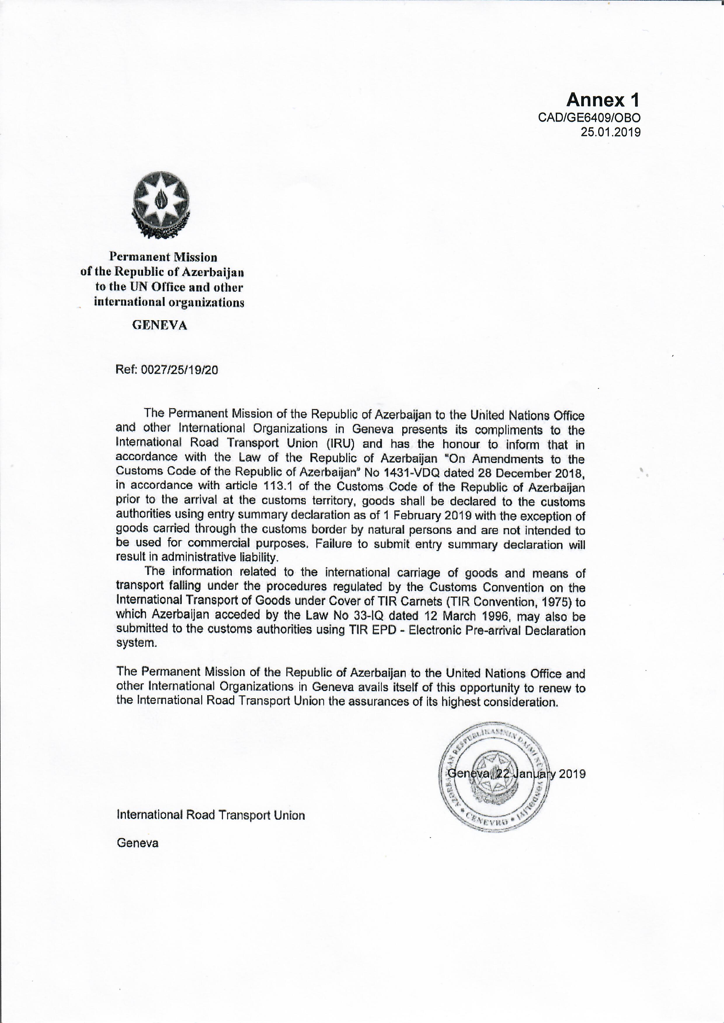 بر اساس اعلام سازمان ایرو به نقل از دفتر دائمی جمهوری آذربایجان در سازمان ملل، با توجه به الحاق این کشور در 12 مارس 1996 به کنوانسیون تیر و اصلاح آئین نامه گمرکی در مورخ 28 دسامبر 2018، ارسال الکترونیکی اطلاعات کالا و کامیون به جزء کالاهای فاقد ارزش تجاری همراه افراد حقیقی از 1 فوریه 2019 (12بهمن1397) امری اجباری تلقی می شود و عدم رعایت آن، تعهدات اداری را برای شرکت حمل و نقل در پی خواهد داشت.
