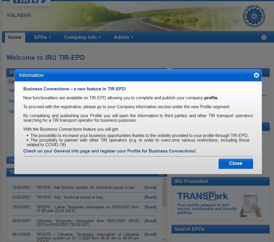 به استحضار میرساند، سازمان ایرو در ابتکار جدید بستری را فراهم نمود که شرکت های عضو کارنه تیر می توانند پروفایل و مشخصات شرکت ها و حوزه فعالیت خود را جهت آگاهی اشخاص ثالث فعال در حوزه تجارت اعم از کریر، فورواردر و صاحب کالا در سطح جهان قرار دهند. شرکت می تواند باتکمیل پروفایل خود درقسمت اطلاعات عمومی(General info) در