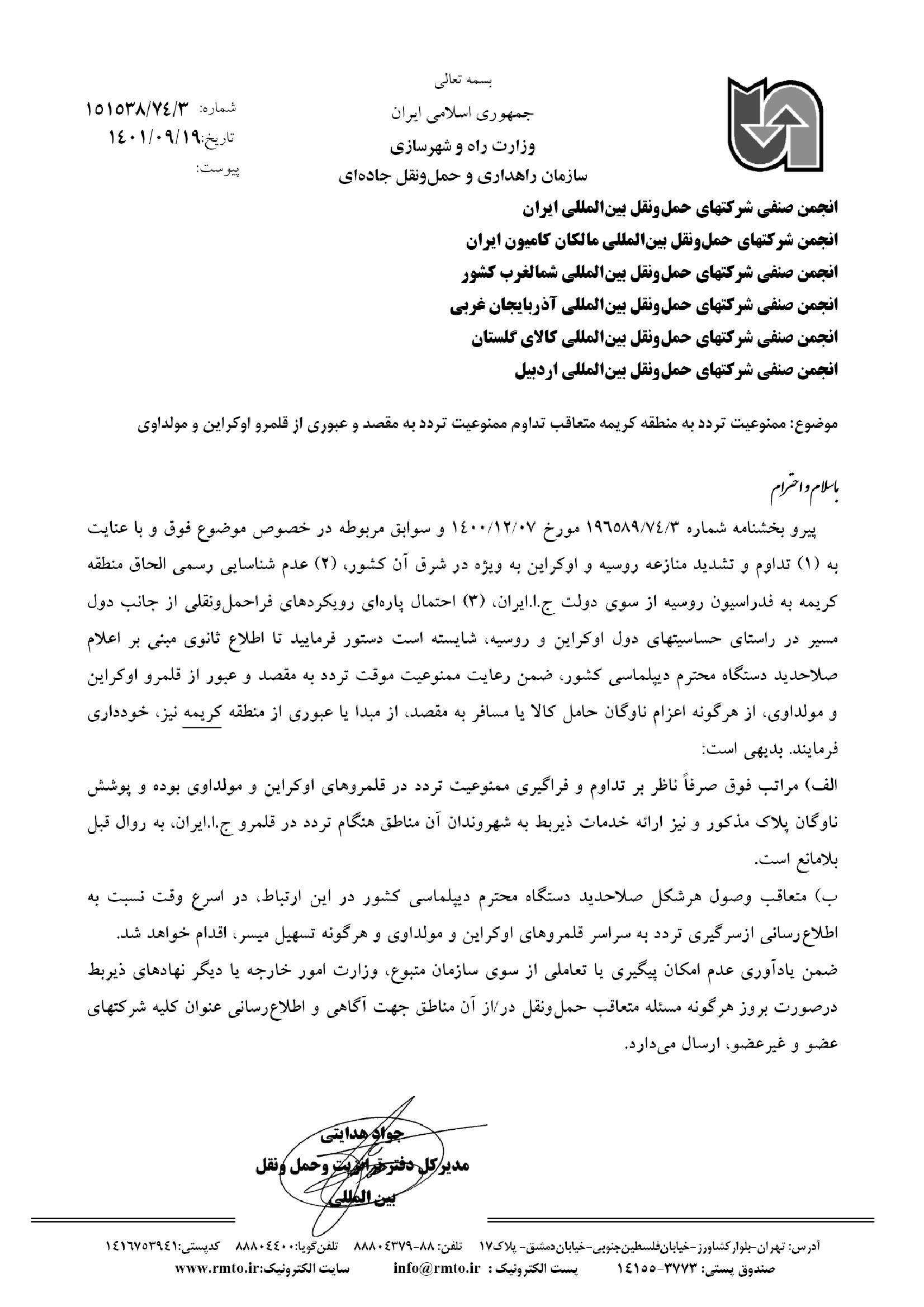 بپیوست تصویرنامه سازمان محترم راهداری و حمل و نقل جاده ای به شماره 3/74/151538 مورخ 19/09/1401همراه با تصویربخشنامه شماره 3/74/196589 مورخ 07/12/1400 آن سازمان محترم در خصوص رعایت ممنوعیت موقت تردد به مقصد و عبور از قلمرو اوکراین و مولداوی و خودداری از هرگونه اعزام ناوگان حامل کالا یا مسافربه مقصد،ازمبدایا عبوری ازمنطقه کریمه جهت استحضار وهرگونه بهره برداری ارسال می دارد.