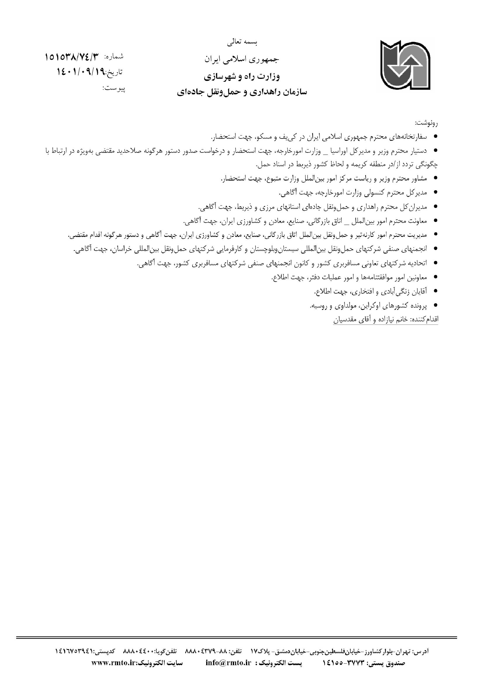 بپیوست تصویرنامه سازمان محترم راهداری و حمل و نقل جاده ای به شماره 3/74/151538 مورخ 19/09/1401همراه با تصویربخشنامه شماره 3/74/196589 مورخ 07/12/1400 آن سازمان محترم در خصوص رعایت ممنوعیت موقت تردد به مقصد و عبور از قلمرو اوکراین و مولداوی و خودداری از هرگونه اعزام ناوگان حامل کالا یا مسافربه مقصد،ازمبدایا عبوری ازمنطقه کریمه جهت استحضار وهرگونه بهره برداری ارسال می دارد.