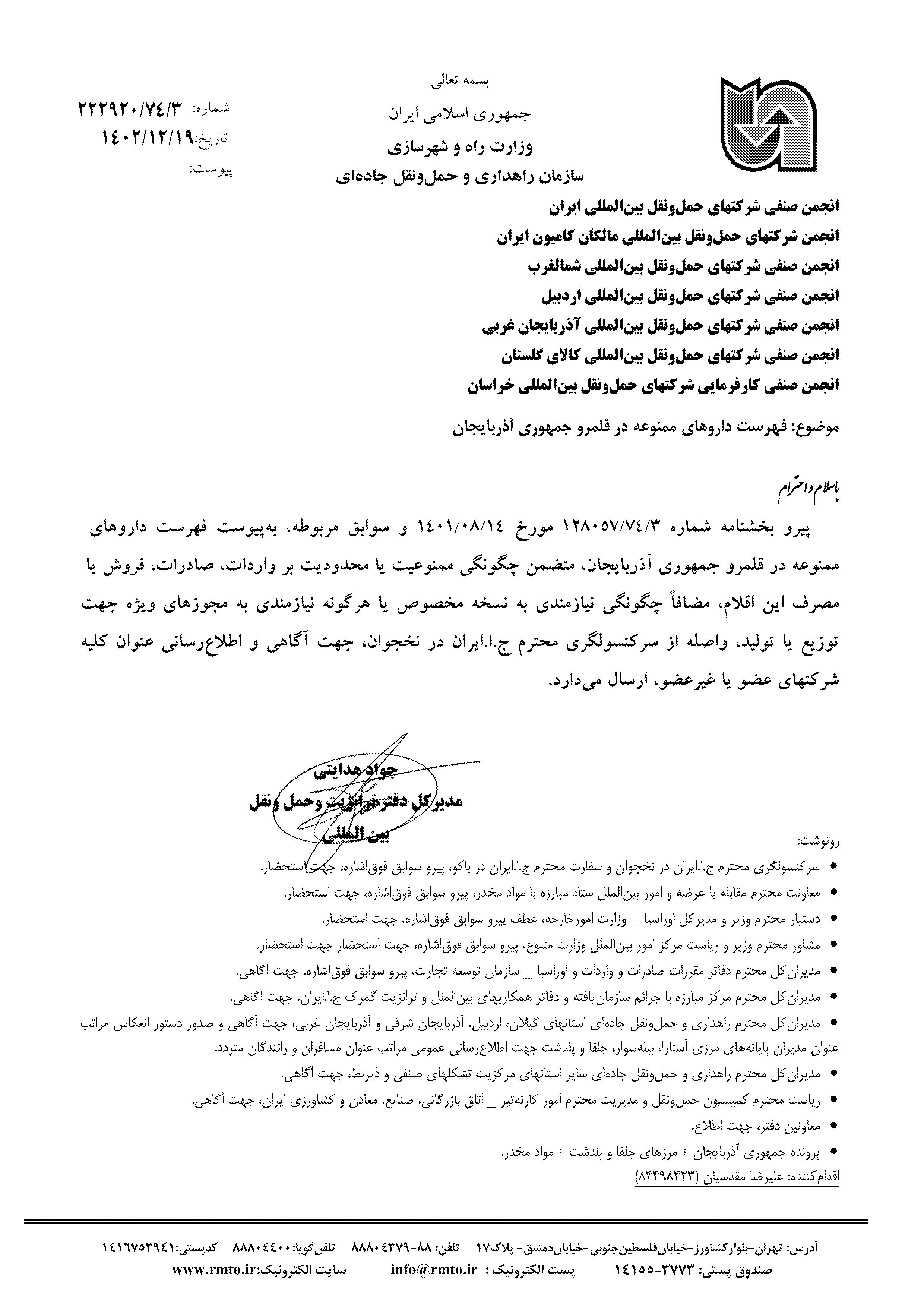 بخشنامه سازمان راهداری در خصوص فهرست داروهای ممنوعه در قلمرو جمهوری آذربایجان جهت هرگونه بهره برداری به پیوست می باشد.